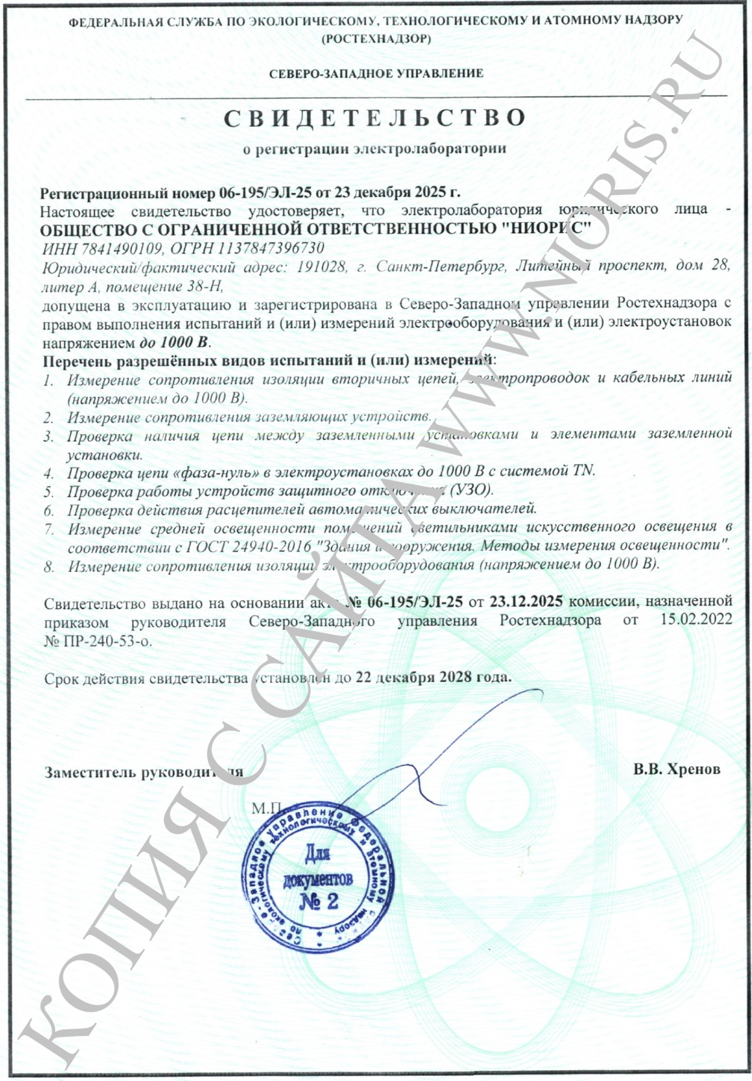 Свидетельство о регистрации электролаборатории